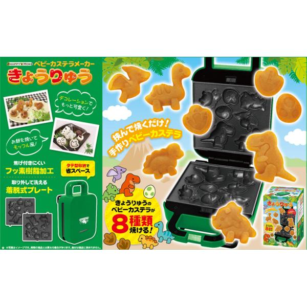 - 【製品の特長】 ●挟んで焼くだけ!手作りベビーカステラ ●かわいいきょうりゅうのベビーカステラが8種類焼けます ●チョコペンでデコレーションしたり、お餅を焼いてモッフル風にしたりとアレンジが楽しめます ●プレートは焦げ付きにくいフッ素樹脂加工済み ●お手入れもラクラクの着脱式プレートを採用 ●立てたまま収納できるので、省スペースで収納可能です 【製品仕様】 商品名 :ベビーカステラメーカー 恐竜 商品サイズ :約H21×W13.3×D9.5cm(コード除く) 商品重量 :約1000g 電源 :家庭用100V電源使用 定格電圧 :AC100V 定格消費電力:520W 定格周波数 :50/60Hz 温度ヒューズ:240℃ コード長 :約0.7m