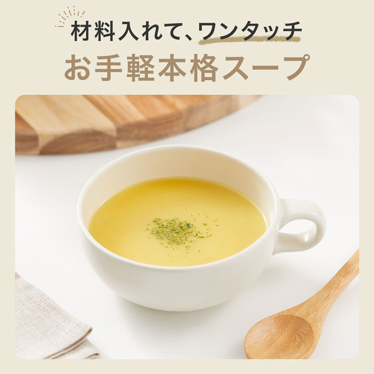 - 返品・キャンセルについて※ご購入前に必ずご確認ください 当店おすすめキッチン!ほかのキッチンを見る ≫ たっぷり味わう、飲む野菜。 商品のご紹介 サイズ幅21×奥行15×高さ28.6cm 素材本体:ステンレス鋼、ポリプロピレン カラーオフホワイト 重量約1.8kg 梱包サイズ幅24.2×奥行19.5×高さ32cm(約2.15kg) 配送について・複数の商品を同時にご注文いただいた場合、異なる配送会社から配送が行われる場合がございます。 商品ごとのお届け日に関しましては、発送通知メールをご確認ください。・離島および一部地域からご注文いただいた場合、送料の追加料金が発生する場合がございます。・商品のサイズや重量をよくご確認のうえ、搬入経路のご確認と必要に応じて2人での受取をお願いいたします。・商品の配送は玄関先までとなります。 開梱、組立、設置などは致しませんので、予めご了承ください。 備 考・掲載画像の一部にAIで生成したものを使用しております。 定格電圧:AC100V 定格周波数:50/60Hz 定格消費電力:ヒーター部:800W、モーター部:150W 定格容量:HOT:1000ml(スープ/豆乳/ヨーグルト/保温/沸騰)、COLD:1250ml(ジュース) 電源コード:約1.5m 【商品コード】オートクックポットスープココ →チャットで調べるチャット形式でお問い合わせいただけます。商品に関するお問い合わせは商品説明上部の商品番号をお控えください。