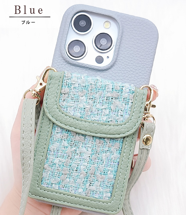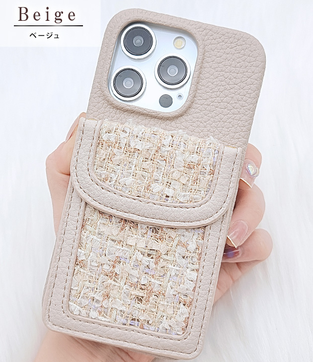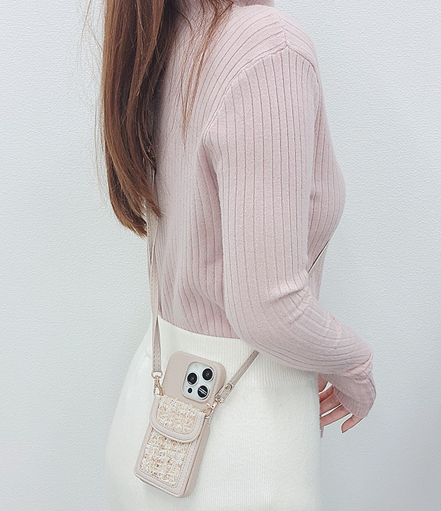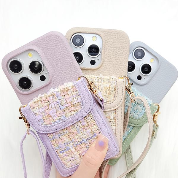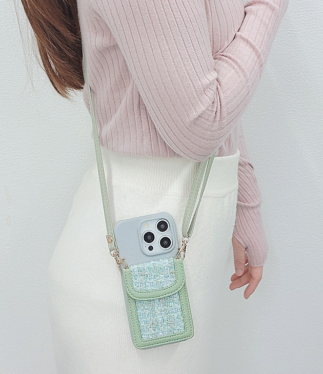 カラーツイードポケット付きレザー調iPhoneケース 女性 レディース スマホ 携帯 バッグ 2WAY ストラップ ショルダー スマート I