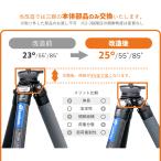 本体部品を交換することで開脚角度を23度から25度へ拡げて安定性を向上。特に横方向からの力に強くなりますが開脚角が拡がる分、3%程度全高が低くなります。開脚2段階目(55度)と3段階目(85度)の開脚角度に変更はありません。