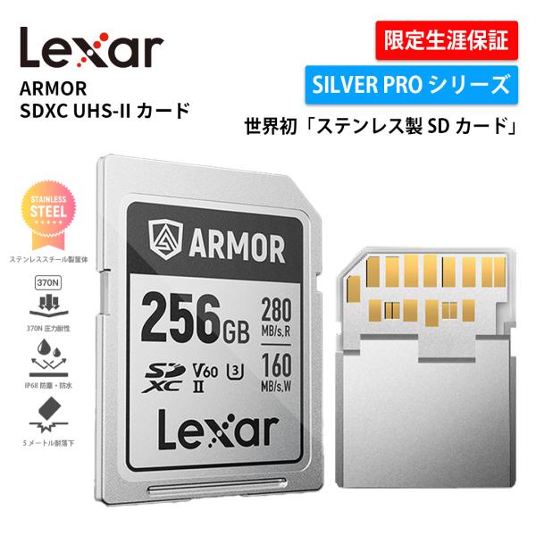 【正規代理店】Lexar ARMOR SILVER PRO SDXC UHS-II カード256GB V60 U3 6K 30P ステンレススチール製SDカード動画撮影対応 商業写真 高速連写撮影 防水圧力耐性