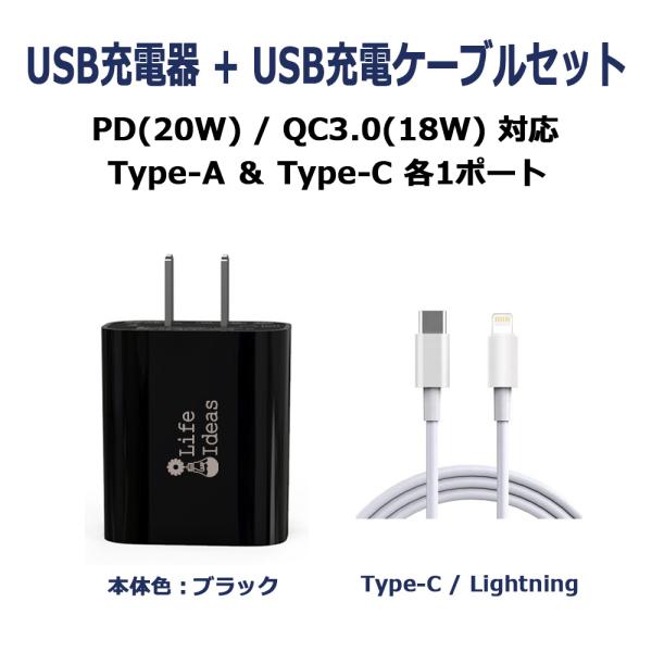 USB充電器 Type-C/PD/20W Type-A/QC3.0/18W 2ポート同時充電 ブラック Lightning充電ケーブル付 1年保証[M便 1/3]