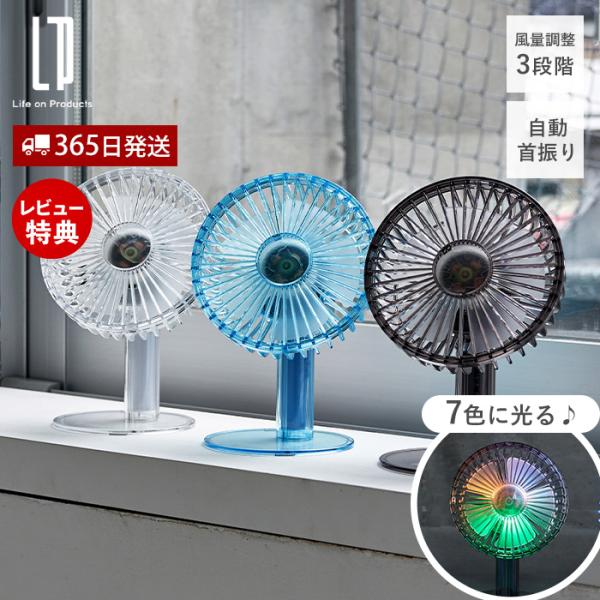 人気のクリアシリーズに首振り機能付きのデスクファンが登場。LEDライト搭載で7色に光ります。