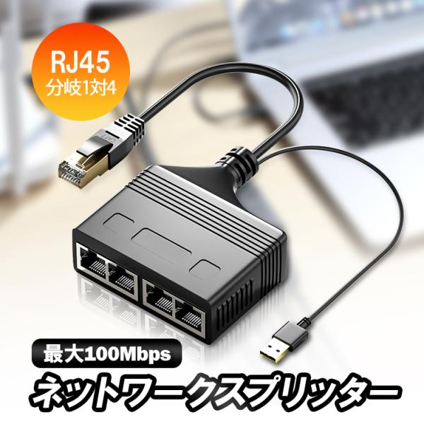 RJ45ネットワークスプリッター 1入力4出力 4台同時接続可 100Mbps高速転送 USB給電 設置簡単 RJ45LAN分配器 LAN中継コネクタ延長 自宅 職場 店舗 ホテルRJ10014