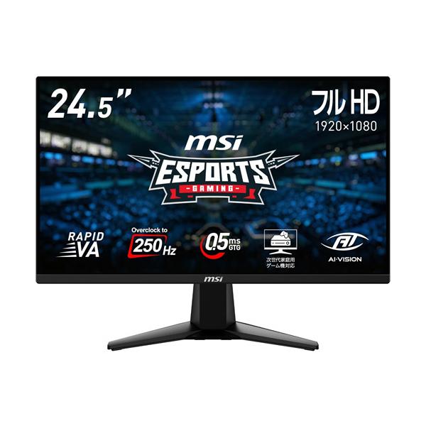 - MSI エムエスアイ Rapid VA 液晶モニター ▼駆動方式:Rapid VA 型 ▼表面処理:ノングレア(反射防止) ▼液晶パネルサイズ:24.5型 ▼最大解像度:1920×1080 ▼最大リフレッシュレート:250Hz ▼コントラスト比:3000対1 ▼HDMI端子:2 ▼VESAマウント対応:100mm ×100mm ▼ピボット対応:× ▼重量:3.3kg