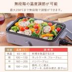 - 商品説明★ 2種類のプレートで料理を楽しむ・平面プレート汚れがつきにくいフッ素コーティング加工のプレート・たこ焼きプレートたこ焼きはもちろん、アヒージョやベビーカステラなどの調理もできます。★ シンプル操作温度調節つまみをまわすだけ。シンプルだから使いやすい!★ 無段階の温度調節が可能最大250℃まで無段階で調整ができます。★ 使いやすいコンパクトサイズ2〜3人にちょうどいいコンパクトサイズで調理にも収納にも便利★ 安全設計・サーモスタット機能設定温度に達するとランプが消灯し、温度の上昇を防ぎます・マグネット式コンセントコードにうっかり足を引っかけてもポンと外れるので安心★ ラクラクお手入れプレートは外せて丸洗いが可能です。プレート表面にはフッ素加工を施しているので、こびりつきにくくお手入れが簡単。※本体の丸洗いは絶対にしないでください。※本体+ヒーターは柔らかい布で汚れを拭き取ってください。★ 本体重量約3.4kg女性でも楽に持ち運べる軽さです。スペック* 定格電圧:AC100V、50Hz/60Hz* 定格消費電力:1200W* 温度調節範囲:切/保温〜250℃* ヒーター:シーズヒーター* プレートの種類:ヒーター分離式* 質量(約):3.4kg(ふた、ソケット、平面プレート、たこ焼きプレート含む)* 外形寸法(約):幅371×奥行237×高さ134mm* 電源コード(約):1.8m* 材質…・プレート:アルミ合金(フッ素樹脂コーティング)・ふた:スチール・本体、つまみ:フェノール樹脂* セット内容:本体、電源コード、たこ焼きプレート、平面プレート