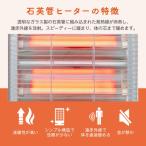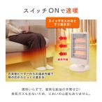 - 商品説明★ スイッチONで速暖燃料いらずで、面倒な給油の手間ゼロ!排気ガスも出ないため、においの心配もありません。★ 石英管ヒーターの特徴透明なガラス製の石英管に組み込まれた発熱線が赤熱し、遠赤外線を放射。スピーディーに暖まり、体の芯まで暖めます。★ 体の芯からあたたまるワケ遠赤外線によって、体内の分子を振動させその熱が全身に広がることによって体をあたためます。★ 持ち手付きで移動も楽々移動に便利な持ち手付き。軽量で持ち運びも簡単なので、お好きな場所でお使い頂けます。★ 左右スイングで部屋のすみずみまであったか左右に自動首振り対応で、部屋中にあたたかさを届けます。★ 転倒時OFF機能内蔵子供・ペット・地震にも安心!倒れると自動で電源OFF。火災リスクを軽減する安全機能付き。※自動電源OFF機能は、内蔵のためボタン等はありません。また、本体を持ち上げても自動で電源OFFにはなりません。★ 過熱防止機能内蔵内部の温度が異常に高くなった場合に自動的に電源が切れるサーモスタットを内蔵。★ お手入れラクラク前面のガードは簡単に取り外し可能。ホコリや汚れが気になった時にサッと外して拭き取れるので、いつでも清潔に使えます。スペック* 定格: 交流100V* 消費電力: 900W(強運転)、600W(中運転)、300W(弱運転)* 本体寸法: 幅32cm×奥行32cm×高57.8cm* 質約:3kg* 電源コード長: 約1.8m* 安全装置: 転倒OFFスイッチ、サーモスタット* 1時間あたりの電気代※ .* 弱運転時(300W):約9.3円 .* 中運転時(600W):約18.6円 .* 強運転時(900W):約27.9円※1時間あたりの電気代、単価31円/kWh(税込)計算し大た際の目安となります。
