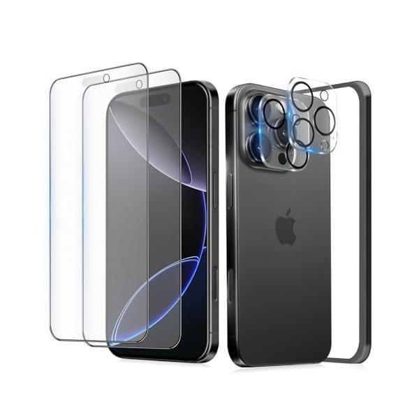 ・対応機種 iPhone 16 pro 用(6.3インチ対応)。パッケージ内容 iPhone 16pro ガラスフィルム * 2枚セット + iPhone16pro カメラフィルム * 2枚セット + ガイド枠 * 1枚。製品の特徴 全面保護/気泡なし/耐衝撃/剥がれない/割れない。