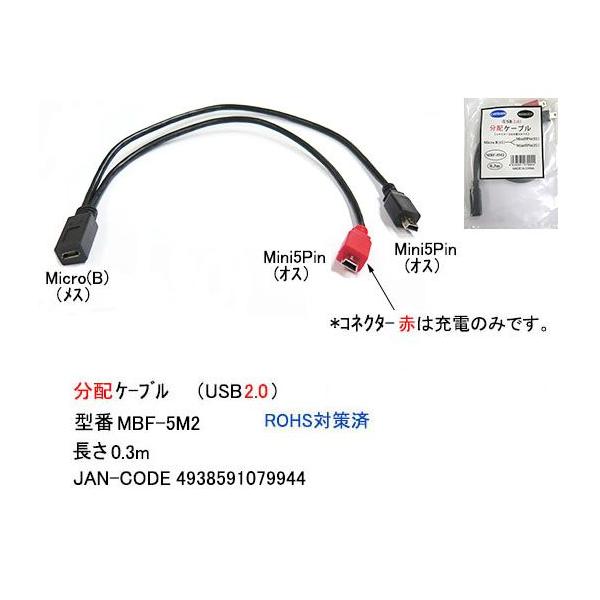 - MicroB-MiniB+MiniB(充電専用)ケーブル 使い方は様々なケーブル MiniB(5pin)+MiniB(5pin)充電専用端子を補助電源に使ってMicroB側端子へ電力供給量を少し増やして電気を多めに使う周辺機器を接続したり MicroB側へ充電器やバッテリー・パソコン等を接続し黒色端子で充電やデータ転送を行い赤色端子では充電のみ行う等の分配ケーブルとしても利用可能 ※供給電力が追い付かない場合は動かない、充電出来ない事や充電が遅い等発生いたします。 ※HOST機能は付いておりません。 ※端子形状にはご注意ください。 ※MHLには対応しておりません。 ※全ての機種、変換形式に対応するものではございません。 商品説明 MicroB (メス) MiniB(5pin)(オス) MiniB(充電専用)(オス)(赤色端子) 全長:約30cm HOST(OTG)機能はありません。 内容量 1個 RoHS ROHS対応 梱包 簡易包装にてお届けいたします。 端子には数種類の規格がございますのでご購入時にはお使いの製品・サイズ・規格等を確認した上でご購入お願いいたします。 また、機器によりましては相性などにより正常に動作しない場合もございます。 メーカー様の都合にて形状や長さ等が画像と異なる場合がございますがご了承お願いいたします。 不良品以外の返品・交換はお断りさせて頂いております。 保証期間・商品発送後2カ月とさせて頂きます。
