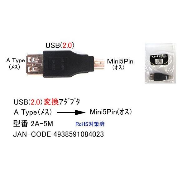 USB2.0 変換アダプタ タイプA メス ⇔ MiniB 5Pin オス UA-2A-5M