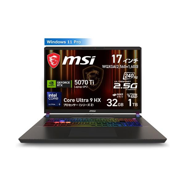 - MSI エムエスアイ リフレッシュレート240Hz ゲーミングノートPC ▼CPU名称:Intel Core Ultra 9 ▼メモリ(標準):32GB ▼ディスプレイサイズ:17型 ▼グラフィック機能:GeForce RTX 5070 Ti ▼無線LAN:IEEE 802.11be/ax/ac/n/g/a/b ▼プリインストールOS:Windows11 Pro