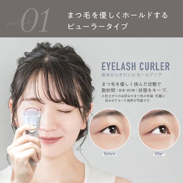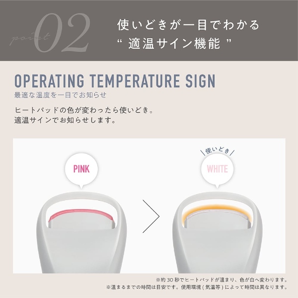 適温サインで使い時が一目でわかる。温度設定2段階の充電式ホットアイラッシュカーラー。