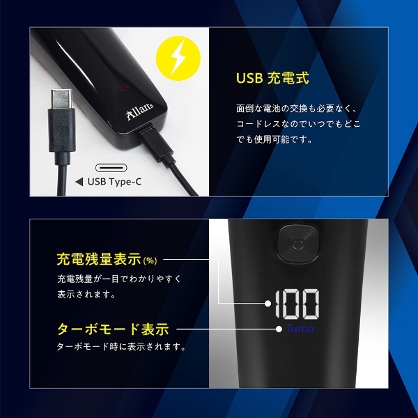 通常モード/ターボモードの2段階速度調節が可能な、USB充電式のシェーバー。