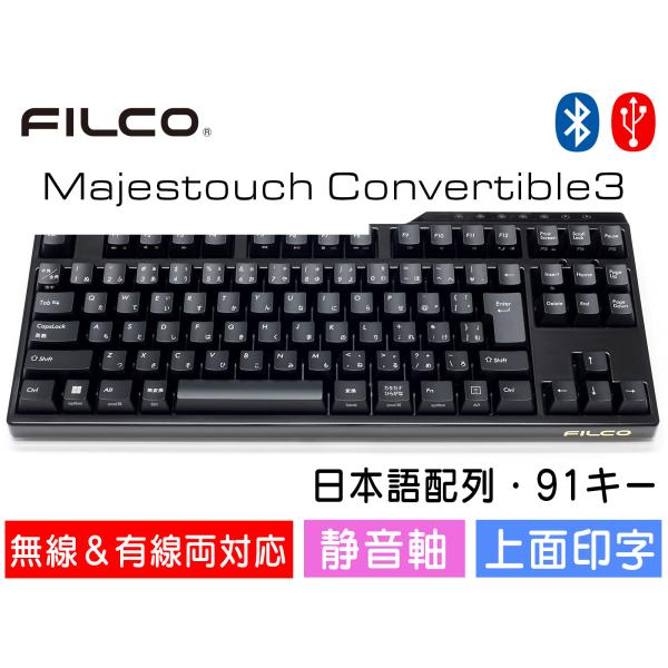 FILCO Majestouch Convertible 3 漆黒七分艶モデル 静音赤軸 テンキーレス 日本語配列 91キー Bluetooth無線&USB有線両対応 DIPスイッチ