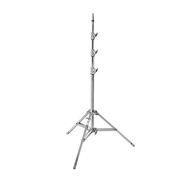 - 4段3ライザー構成のクロームメッキスチール製スタンドです。最大10kgの機材を保持することができ、3mの高さまで伸ばすことが可能です。不整地でも使いやすいよう、水平調整脚を1本備えています。また、5/8インチ(16mm)のトップアタッチメントを備えています。 耐荷重:10kg 水平調整脚数:1 全伸高:300cm 4 sections, 3 risers, O: 35, 30, 25, 20 mm