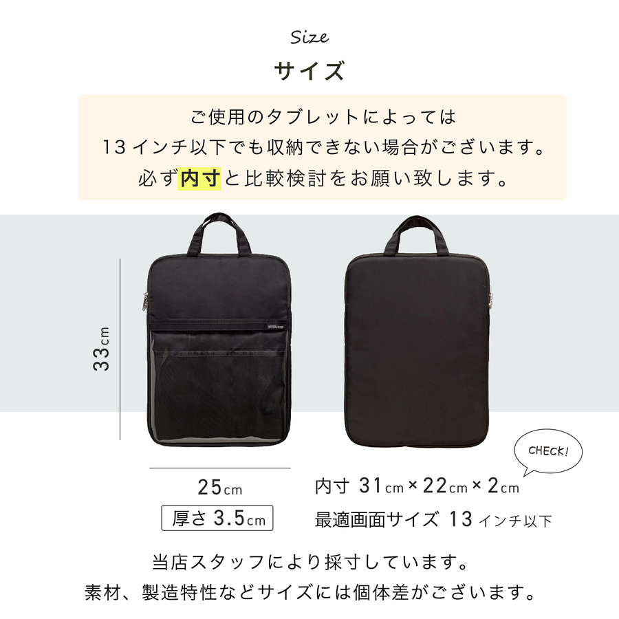- ▼ こちらの商品もオススメ ▼ タブレットケース ブランド NATURAL design 材質 ナイロン、ポリエステル他 サイズ 外寸:約33×25cm 厚さ:約3.5cm 内寸:約31×22×2cm 最適画面サイズ:~13インチ 重量 約150g 生産国 中国 毎日使うタブレットを、やさしくしっかり守るタブレットケース。 撥水加工生地で雨や汚れに強く、内側はウレタンクッション仕上げで衝撃を軽減します。中が見えるクリアポケットとメッシュポケットで、小物類をスッキリおしゃれに収納。カラフルな名入れができるので、自分だけの特別なケースに。通園・通学はもちろん、習い事にも安心して使えます。 小学生 小学生向け 子供用 キッズ 小学校 学校用 学習用 GIGAスクール 授業用 持ち運び 撥水 収納 ポケット付き 軽量 丈夫 取っ手付き ファスナー付き 男の子 女の子 シンプル かわいい おしゃれ 黒 パープル グリーン 可愛い 名入れ 名入れ加工について ●名入れ加工はご注文をいただいた時点でキャンセル・変更受付は出来かねます。 ●加工を施してしまうと、商品が販売不可の状態となりますので、キャンセル・ご返品・受取辞退などを申し出られた場合、商品代金の100%をご請求させて頂きます。なにとぞご了承ください。 ●万が一の文字入力ミスや、名入れのご確認の為にご連絡させていただく場合がございます。ご注文時はご連絡のつきやすい電話番号や、メールアドレスをお知らせください。ご連絡の取れない場合、納期が遅れる場合がございます。 ●旧漢字など特殊な漢字の場合、加工できない場合もございます。 (例: 吉 の上部分が「土」の漢字は不可) ●加工の際は、お客様にご記入頂きました文字をコピー・ペーストして加工をしております。 お選びいただいた書体によっては、文字や文字間の見え方に違いが生じる場合もございます。予めご了承ください。 ●文字の見え方によるご注文のキャンセル等はお断りさせて頂いております 明細について 当店では、明細書など金額のわかるものはお付けしておりません。 【重要】名入れ加工済商品についての初期不良等ご連絡先 メーカー様によりましては、加工済商品につきましてご対応不可案内になる場合がございますため、当店へご連絡をお願い申し上げます。 確認事項 ※商品の色味はなるべく実際の商品に近い色味でお伝えすべく撮影及び画像処理には気を配っておりますが、ページをご覧頂くモニターなどの環境により色味・風合いは多少異なる場合がございます。予めおご了承ください。 商品に関するご質問、ご不明な点がございましたら、ご注文前にお問い合わせください。 ※画像にサイズ表記のある場合は当店スタッフが計測したサイズとなり、品質表示と異なる場合がございます。あらかじめご了承ください。