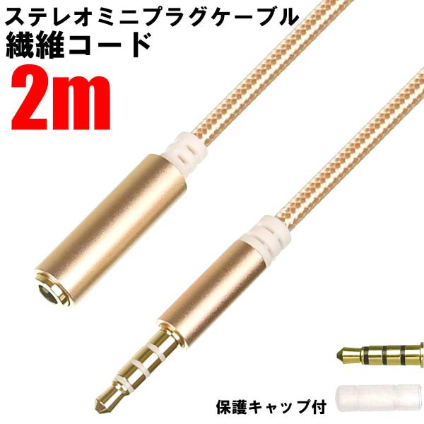 ANE ステレオミニ延長ケーブル 200cm(2m) 繊維コード ゴールド 4極 金メッキ端子 直型 AUX オーディオケーブル ステレオミニプラグ テレワーク 通話 会議