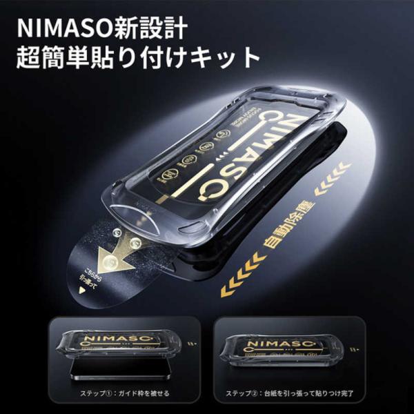 - 「被せて引くだけ」神ガイド枠同梱進化した次世代のガイドBoxでさらに貼付けがカンタンになりました。フィルムをガイドBoxに固定したまま、iPhoneに被せてシートを引っ張るだけで確実にフィルムを貼付けられます。貼付け前のクリーニングに便利なクロスやホコリ取りシールも付属しています。99.9%の透過率を誇る高光沢仕様透明度の高い強化ガラスを0.33mmの超薄型に加工したことで、iPhone本来の画質を損なわずに画面を保護します。【初回生産分限定】表面硬度9Hのカメラレンズ用保護フィルムも付属極薄の専用設計でしっかりとカメラレンズを保護するフィルムも同梱。指紋や汚れが付着しにくいコーティングで写真の美しさを損ないません。NIMASO独自の最大30ヶ月延長保証通常の1年保証に加え、最大で30ヶ月の延長保証により保証対象内の故障について交換対応が可能です。※延長保証にはNIMASOカスタマーサポートでの会員登録とお申し込みが必要です。※保証内容の詳細はNIMASOカスタマーサポートからご確認ください。