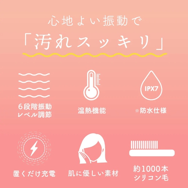 - 商品情報商品の説明主な仕様 【毛穴にアプローチ】この電動洗顔ブラシは最大毎分10,000回振動する。無理な力を加えることなく、振動の力を利用して汚れを浮かし、スッキリ洗浄。やさしく汚れを落としてお肌スッキリ。【温熱ヘッドで負担をかけずメイクオフ】温感でメイクをなじませて、簡単クレンジング。温熱ヘッドでクルクル洗浄、クリアなお肌へ!【防水レベルIPX7】防水レベルIPX7だから、お風呂でも安心してご使用いただけます。※IPX7は一般的に一定水圧の条件に水没しても、内部に浸水することがない程度(防浸形)【毎日使ってほしいから、使いやすさにこだわりました】 人間工学に基づいた、手にフィットしやすい形状を開発。 また、105gと缶コーヒーの約半分の重さで、小柄な女性でも手軽に使えます。充電は、ワイヤレス充電台に置くだけでOK!※充電台はUSBコード式【お肌に優しいシリコン素材】赤ちゃんのお肌にも使える食品衛生法に適合したシリコンを採用。