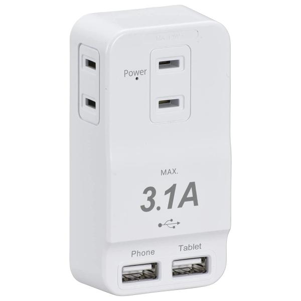 - 特長 ●通電火災対策に ●特許技術(第5853076号)採用 差込口の温度が150℃になると、発煙に至る前に自動的に通電を遮断 ●USB過電流防止機能付き 最大出力容量を超えた場合、自動的に電源供給をストップ ●USB機器を2つまで充電できます(合計最大電流3.1A) ●AC機器を3つまで接続できます(合計最大電力1400W) ●通電表示LEDランプ付き ●本体カラーは白 商品仕様 ●コンセント:3個口 ●USBポート:Type-A 2個口 ●AC出力:合計1400Wまで ●DC出力:合計3.1A