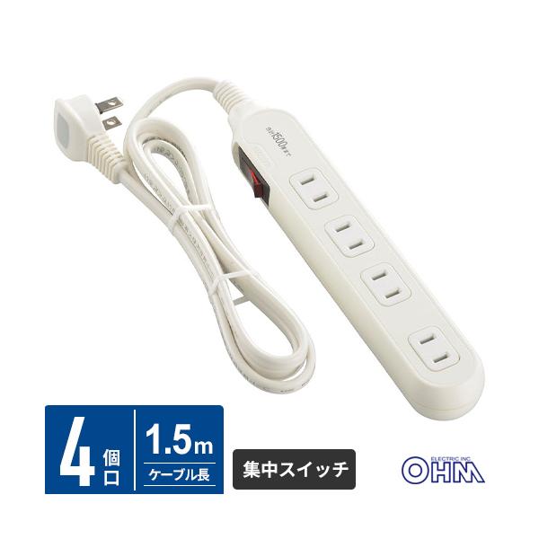 オーム電機 4個口タップ ブレーカー付き 1.5m HS-TB415W22