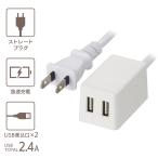 - 【 特 長 】 ● USB充電ポート×2ポート搭載、合計出力2.4A ● 急速充電対応 ● 接続機器を自動で判別して適切な電力で効率よく充電 ● USB過電流保護機能付き ● 本体まるごと燃えにくい自己消火性PC樹脂活用 ● 導線の二重被ふくでコードの強度を向上 ● 耐トラッキング絶縁カバー付き ● 本体カラーはホワイト 【 仕 様 】 ■ 定格入力:AC100V 50/60Hz 28VA ■ 定格出力:DC5V 合計2.4A ■ USB:Aタイプ ■ USBポート:2個口 ■ プラグ形状:ストレートプラグ ■ コード長:2m ■ 対応機種:本機はUSB充電に対応したスマートフォン、タブレット、モバイルバッテリーなどに使用できます ≪使用上のご注意≫ ・USBケーブルは付属しておりません。お使いの機器に対応したUSBケーブルを別途ご用意ください。(機器に付属する純正品のご使用を推奨いたします。) ・使用前に、必ず接続する機器内のデータのバックアップをお取りください。データの消失、破損、機器の故障などについて、メーカーでは一切の責任を負いかねます。 ・通信機能付きのUSBケーブルではご使用いただけない場合があります。