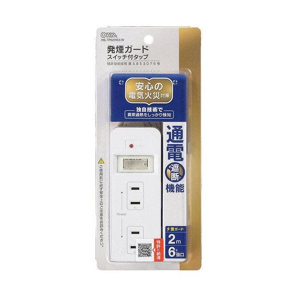 OHM オーム電機 発煙ガードスイッチ・雷ガード付安全タップ(6個口/2m/ホワイト) HS-TP62HS3-W