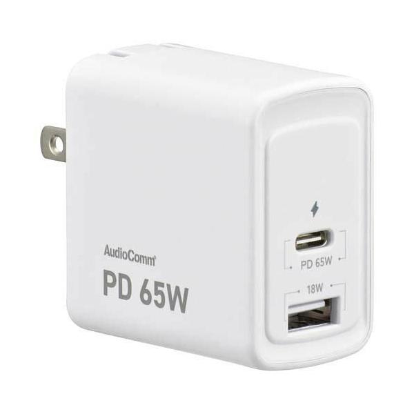 OHM オーム電機 AC充電器(GaN採用 /Type-A+Type-C/USB PD/最大65W給電による高速充電/ホワイト) MAV-AUPD65-W