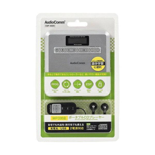 - [オーム電機 ポータブルCDプレーヤー MP3対応 AudioComm シルバー CDP-400N [CDP400N]] の商品説明●レジューム機能搭載で語学学習に便利です。●手もとで操作できるコントローラーなど、使いやすい機能が充実。●乾電池とUSBの2電源対応(microUSB端子付)。●プログラム再生、リピート、ランダム再生ができる。●電源ON時に前回の続きから再生できる、レジューム再生機能付き。●MP3ディスク対応。●音飛び防止(ESP)機能付き。●ボタンの誤動作を防ぐホールド機能付き。●専用コントローラー、ステレオイヤホン、USB充電コード付属。[オーム電機 ポータブルCDプレーヤー MP3対応 AudioComm シルバー CDP-400N [CDP400N]]のスペック●出力端子:イヤホン出力(φ3.5mmステレオミニプラグ)●チャンネル数:2チャンネルステレオ●周波数特性:20Hz〜20kHz●実用最大出力:15mW+15mW(イヤホンジャック)●再生可能ディスク:CD、CD-R、CD-RW/CD-DA、MP3形式●使用時間の目安:約8時間(アルカリ乾電池新品使用時)●ESP音飛び防止機能:CD-DA 約60秒、MP3 約120秒●電源:DC3V/単3形アルカリ乾電池×2本(別売)、外部電源/DC5V 1A(USB給電/microUSB端子)●寸法:W14.0×H2.9×D14.0cm(突起物を除く)●質量:約260g(乾電池・付属品含まず)●付属品:ステレオイヤホン、コントローラー、USB電源コード、保証書、取扱説明書○初期不良のみ返品可