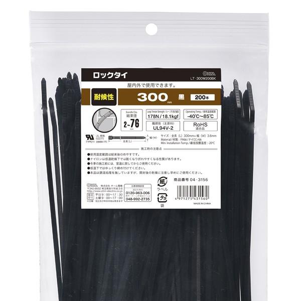 結束バンド ロックタイ 300mm 耐候 黒 200本入り LT-300W200BK 04-3156 オーム電機