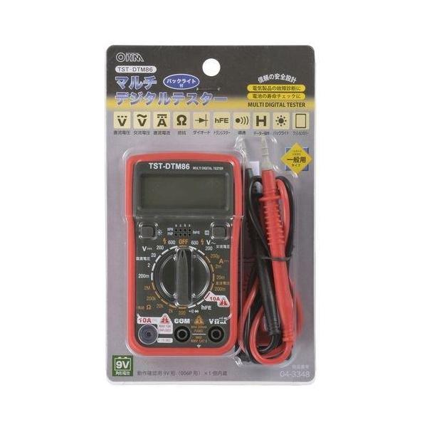 - オーム電機 マルチデジタルテスター ■品番: 04-3348 ■型番: TST-DTM86 ■JANコード: 4971275433489 【特 徴】 ●電気製品の故障診断や、電池の寿命チェックに ●コンパクトサイズで多機能 ●見やすいバックライト付き ●衝撃に強いクッションカバー付き ●作業性のよいデータ保持機能付き 【仕 様】 ■寸法(約):幅65×高さ115×奥行32mm ■質量(約):150g(電池含む) ■使用電池:9V形(006P形)角形乾電池×1個 ■付属品:9V形(006P形)角形乾電池(動作確認用)…1個 ヒューズ(200mA/250V)(本体に内蔵)…1個 テストリード(赤・黒)…1組 取扱説明書(保証書兼用)…1冊 ※製品の仕様は予告なく変更されることがあります。