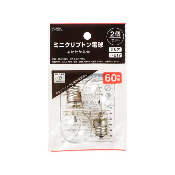 オーム電機 ミニクリプトン電球 E17 60W形 クリア 2個セット LB-PS3554C-2PN 【品番:06-0879】