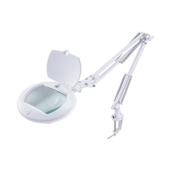 - オーム電機 AS-L8095-2B-W ルーペ付きLEDアームライト エルズーム●両眼で見やすい横長レンズで精密作業におすすめです。●拡大倍率は約1.8倍です。●LEDが環状に配列されているので、手元を周囲から明るく照らし、影を作りません。●白色LED42個使用。約2500ルクス(直下30cm)の明るさです。【仕様】レンズ:ガラスレンズ(約 幅123mm×奥行78mm)倍率:約1.8倍定格:DC21V 350mA使用光源:白色LED×42灯使用(交換不可)/昼白色照度:約2500ルクス(直下30cmで点灯時)全光束:約600ルーメン用途:一般家庭用 屋内専用(屋外使用禁止)消費電力:約6.5W本体寸法(約):ヘッド部…幅190×奥行160mm上アーム長さ…430mm下アーム長さ…350mm(クランプ除く)クランプ取付可能厚:15mm以上60mm以下コード長:約1.9m(コード全体の長さ)質量:約1.35kg(クランプ・専用アダプター含む)付属品:専用ACアダプター、保証書付取扱説明書