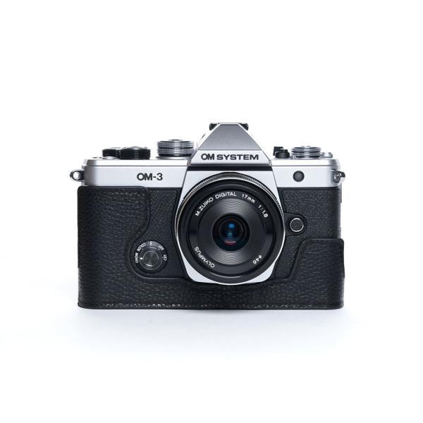 OM SYSTEM OM-3用、レザーボディーハーフケース(ブラックステッチモデル)。ケースを装着したままバッテリー交換が可能です。ケースを装着したままケーブル接続、液晶画面の可動が可能です。ケースを装着したまま三脚・雲台に取り付け可能です。素材にはコロンビアレザー(本革)を使用しています。