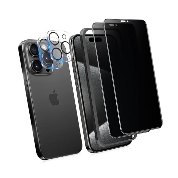 ・対応機種iPhone 15 Pro専用(三眼カメラ、6.1インチ)。パッケージ内容: iphone15pro 覗き見防止フィルム * 2枚 + iphone15pro カメラフィルム * 2枚 + ガイド枠 * 1枚 + クリーニングセット* 2 + 取扱説明書 。対応機種を間違いないようにご購入お願い申し上げます。