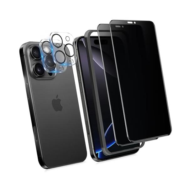 ・対応機種iPhone 16 Pro Max専用(三眼カメラ、6.9インチ)。パッケージ内容: iphone16promax 覗き見防止フィルム * 2枚 + iphone16promax カメラフィルム * 2枚 + ガイド枠 * 1枚 + クリーニングセット* 2 + 取扱説明書 。対応機種を間違いないようにご購入お願い申し上げます。