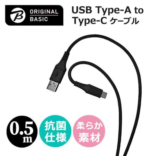 ORIGINALBASIC USB-A to Type-Cケーブル 0.5m シリコーン素材 やわらかい USB-IF認証 抗菌仕様 SIAA認証 ブラック OSUCS1AC050BK