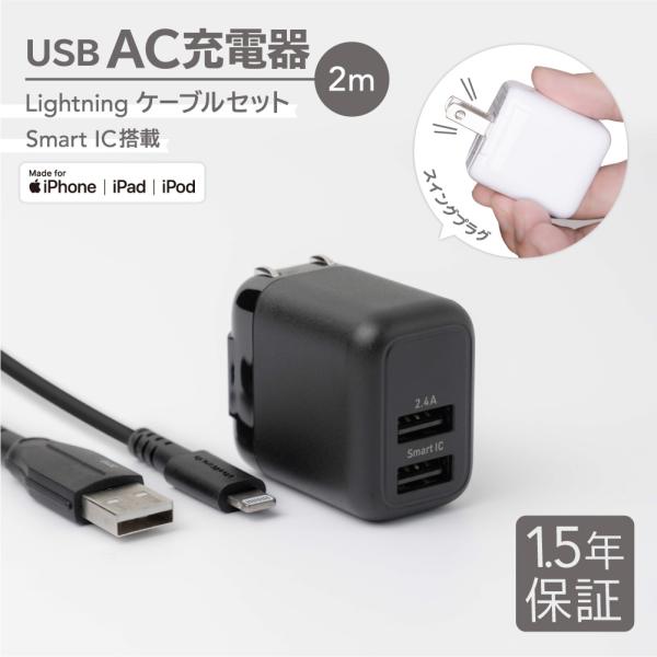 AC充電器 USB Type-A 2ポート 充電ケーブル 2m Type-A to Lightningケーブル付属 Apple認証品(在庫処分)