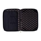四隅を固定できるベルトや、ちょっとした書類やメモ類などを収納できるスリットタイプと、ミニサイズのポケットを2つ配置。タイピングや動画視聴する際の強い味方スタンド機能は、2段階の角度調節が可能です。フロントに配したメタル調のロゴやコインチャーム付きのファスナー仕様も目を惹きます。