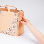 在宅ワークのツールをまとめて収納できる、ツールバッグ。家での使用をメインに考えた仕様になっており、マチが広くたっぷり収納ができPC ケースに入った状態で13インチのノートPC を収納することも可能。付属の仕切り板を差し込みたい位置にセットできるので、ざっくりと中身を分けつつ、荷物の取り出しもスムーズ。インテリアに馴染む、ヌードピンクの「クリザンテーム」柄が上品なデザインで家置きにも最適です。