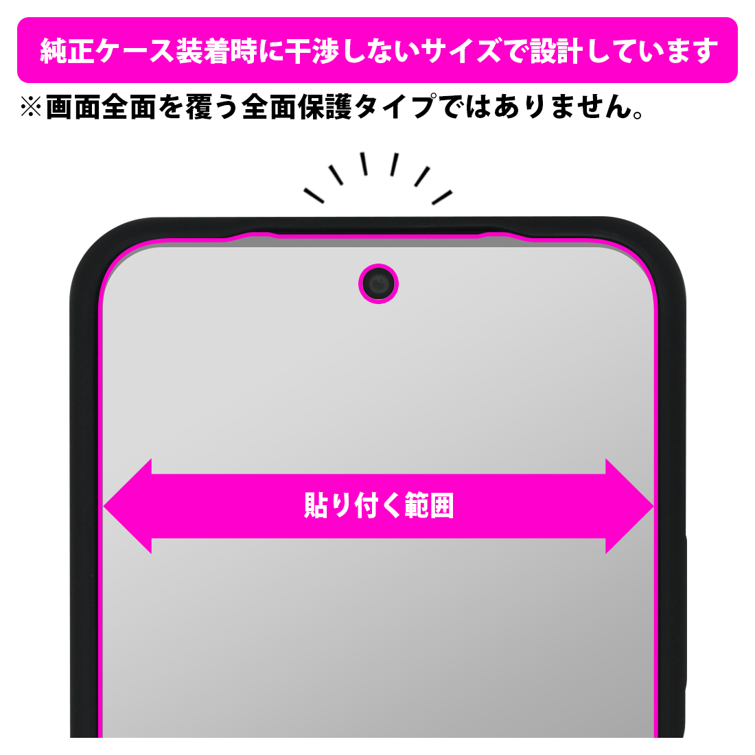 ※製品内容 : 画面用フィルム1枚・クリーニングワイプ1個 ※付属の純正ケース装着時に干渉しないサイズで設計しています。