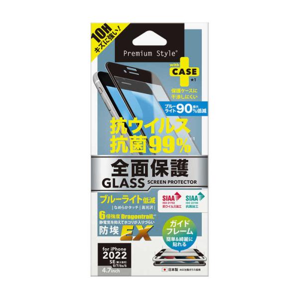 PGA iPhone SE 第3世代/第2世代/8/7専用 ガイドフレーム付 抗菌/抗ウイルス 液晶全面保護ガラス ブルーライト低減/光沢 Premium Style PG-22MGLK02FBL