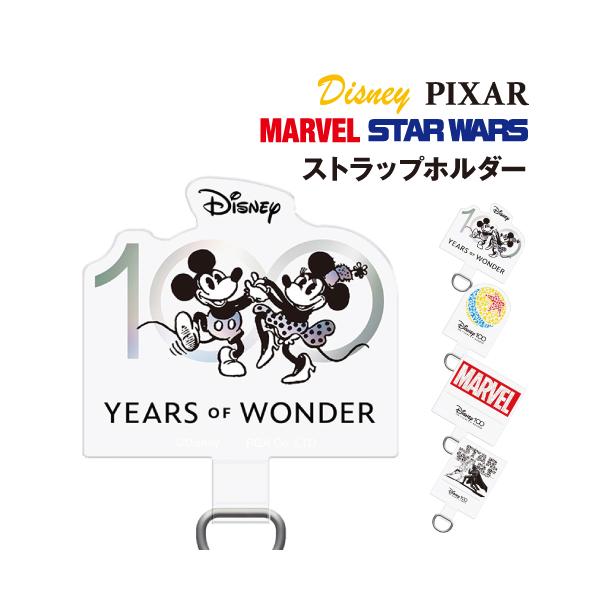 ウォルト・ディズニー・カンパニー創立100周年を記念して作られた特別なアートデザインのストラップホールのないケースに挟むだけでストラップが付けられるダイカット ストラップホルダーです。