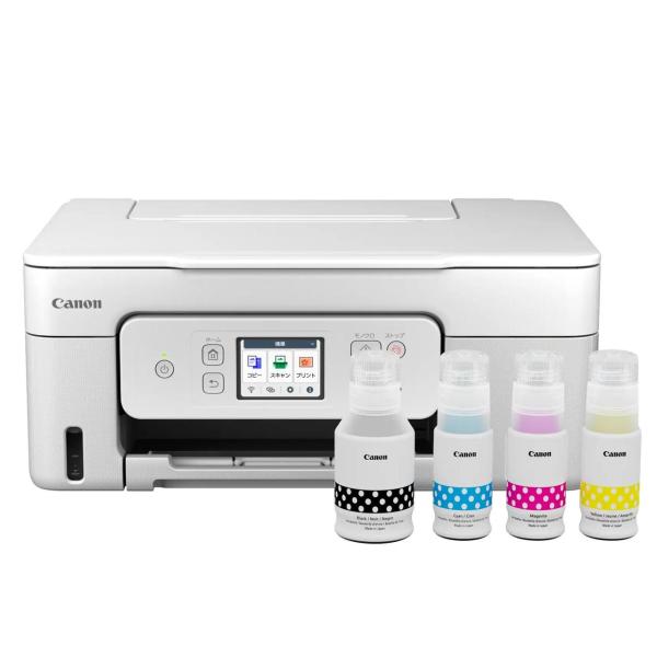 - 商品説明★ 補充の手間を削減!「特大容量タンク」インクボトル各色1本でブラック最大6000枚、カラー最大7700枚の大量出力が可能。※はじめてプリンターをご使用になる歳に充填したインクボトルではなく、2回目以降に充填するインクボトルを使用して算出しています。※印字可能枚数はA4から—文書ISO/IEC24712を使用し、キヤノン独自の測定方法で算出したものです。★ メンテナンス性向上・ご自身で簡単にメンテナンスカートリッジを交換する事ができます(ドライバー不要)。修理の手間や時間を低減できます。・1か所のレバー操作で簡単にヘッドセットが完了します。・インクボトル充填の際、バネの力でキャップが簡単に開きます。★ 液晶モニターが大きくカラーに 使いやすく・2.7型カラータッチ液晶採用。軽いタッチで簡単に操作可能に。・チルト式パネル採用 パネルを45°上げることが可能。・見やすく押しやすい角度に変更でき、快適な操作を実現。★ 経費削減に貢献する「低ランニングコスト」1枚当たりのプリント代が大幅にダウン。印刷する機会が多い業務に、優れたコストパフォーマンスで応えます。★ 「4色ハイブリッドインク」で写真も文書も幅広く写真印刷には発色の良いインク、文書印刷にはシャープな顔料ブラックインクのハイブリッドシステムで美しい表現を可能に。スペック* インク色数:4色タンク型* 使用可能用紙サイズ:[後トレイ]A4、A5、A6、B5、レター、リーガル、洋形封筒4号/6号、長形封筒3号/4号、商用10号封筒、DL封筒、はがき、郵便往復はがき、名刺、L判、KG、2L判、六切、スクエア(127mm)、スクエア(89mm)、ユーザー定義サイズ(幅 55mm〜216mm、長さ 89mm〜1200mm)* 給紙可能枚数:[普通紙]100枚、[はがき]40枚、[写真用紙]20枚* 本体寸法:幅416×奥行363×高さ177mm(収納時)、幅416×奥行555×高さ268mm(使用時)* 質量:約6.5kg* 消費電力:約18W(USB接続コピー時)* 稼働音(PCプリント時)約49dB* 普通紙耐久枚数:50000枚