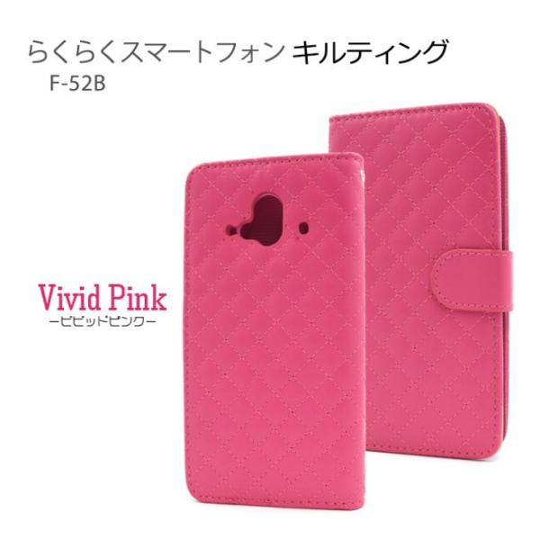 - <スマホケース>らくらくスマートフォン F-52B (2022年発売モデル)用 キルティングレザー 手帳型ケース ビビットピンク df52b-57vp JAN/4573561661486 【年中無休】スマホケース手帳型 RY 触り心地抜群のキルティングレザーを使用したオシャレな手帳型ケースです。衝撃やキズなどからスマートフォンを守ります。また、内部はソフトケースなので着脱が簡単です。背面を折り返すとスタンドとして使用できるので、動画視聴に便利です。落下防止に最適なストラップ&ストラップホール付きです。横開きタイプなので、手帳のように使うことができます。また、内側にカードが2枚収納できるカードポケットが付いています。注意事項★★本製品は2022年発売の「らくらくスマートフォン F-52B」用です。2020年発売の「らくらくスマートフォン F-42A」にはご使用頂けません。★★★広角モードで撮影すると、ケースが映り込む場合があります。※画像の色調はご使用のモニターの機種や設定により実際の商品と異なる場合があります。※本製品はマグネットを使用しておりますのでクレジットカードなどの磁気カードの収納は避け、カードの注意事項をよくご確認の上ご使用ください。読み取り等ができなくなる恐れがあります。※本製品に収納された、カードのデータ等が喪失された場合におきましても、当社では一切保証致しかねます。※長時間接触していたり、強い力で擦れるとスマートフォンに色移りする場合がございます。※本製品をスマートフォンに装着する際には本体や本製品に付着したゴミやホコリをよく取り除いてください。ホコリ等がついたまま装着すると、スマートフォンに傷がつく恐れがあります。※本製品は強い衝撃からスマートフォンを保護することは出来ません。※スマートフォンは付属しません。※ライセンス商品ではありません。※カードは付属しません。※ケースをつけたまま撮影できますが、フラッシュ撮影時にケースの色が映り込む場合があります。 10