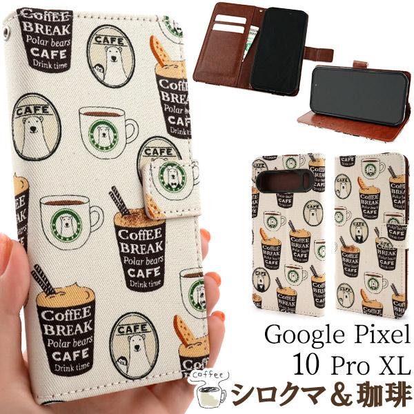 グーグルピクセル GooglePixel 10Pro XL 専用 シロクマ&コーヒー 手帳型ケース くま生地 レザー 保護カバー カフェ 熊 動物ケース スマホ GooglePixel10ProXL
