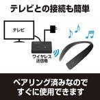 - 在宅ワークやテレビ視聴に活躍するワイヤレスネックスピーカーテレビの音声が耳元ではっきり聴こえる「快聴音+専用スピーカー」マイク搭載、ボタン1つで接続機器が選べるから在宅ワークに便利キッチンなど水廻りでも使える「防滴仕様」など、多彩な機能を搭載寸法(幅×奥行×高さ):189 × 183 × 36 mm原産国:中国【技適マーク認証済み商品 使用する電波の周波数帯:2.4GHz】 在宅ワークやテレビ視聴に活躍するワイヤレスネックスピーカー ・テレビの音声が耳元ではっきり聴こえる※1「快聴音+専用スピーカー」 11 mm×34 mmの専用スピーカー搭載で、ネックスピーカーに不足しがちな低音域を量感豊かに再現。さらに、人の声を強調する「快聴音」機能により、ドラマやニュースの音声が聴き取りやすくなります。 ・マイク搭載※2、ボタン1つで接続機器が選べるから在宅ワークに便利 オンライン会議やハンズフリー通話に便利な「マイク」搭載。また、ボタンを押すだけで付属のワイヤレス送信機とBluetooth(R)接続機器の切り換えが簡単にできる「無線切換」機能搭載により、テレビやスマートフォン・パソコンなど目的に合った使い方が可能です。その他、接続状態が一目でわかる「LED表示」付きなど、在宅ワークがより快適になります。 ・キッチンなど水廻りでも使える「防滴仕様※3」など、多彩な機能を搭載 水がかかりやすい場所でも使える「防滴仕様(IPX4相当)※4」をはじめ、約13時間の長時間再生※5、充電端子は方向を気にせず挿入しやすい「USB Type-C」採用※6、アル コール除菌シートなどによるお手入れに対応※7他、便利な機能が充実。 本機への音声入力がない状態が約5分間続くと、本機の電源は自動的に切れます。(オートオフ機能) ※1聴き取りやすさには個人差があります。 ※2ハンズフリー通話に対応したBluetooth(R)接続機器が必要です。 ※3本機は、JIS C 0920(IEC 60529)「電気機械器具の外郭による保護等級(IPコード)」のIPX4相当の防滴仕様であり、完全防水仕様ではありません。 ※4常温の水道水にて、本機から約20 cm離れて、あらゆる方向から約1.8 L /分の水を10分間ノズル散水したあと、本機が動作することに対応しています。付属のワイヤレス送信機やACアダプター、DCケーブル、音声接続コードは防滴仕様ではありません。すべての条件での防滴を保 証するものではありません。 ※5使用条件や周囲の環境により変わります。 ※6USB Type-Cはワイヤレスネックスピーカーのみ、ワイヤレス送信機はマイクロUSB対応。 ※7ワイヤレスネックスピーカー本体のみ。スプレ ータイプをご使用の際は直接噴射せず、柔らかい布に含ませて軽く拭いてください。すべての条件で、変色・退色がないことを保 証するものではありません。
