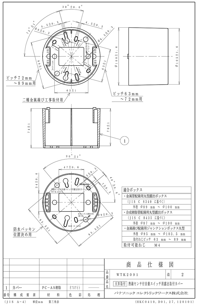 - 【仕様】 ・メーカー:パナソニック ・型番:WTK2091 ・商品名:天井取付熱線センサ付自動スイッチ用露出取付カバー ・かってにスイッチ ・施設向 ・天井取付 ・熱線センサ付自動スイッチ用露出取付カバー