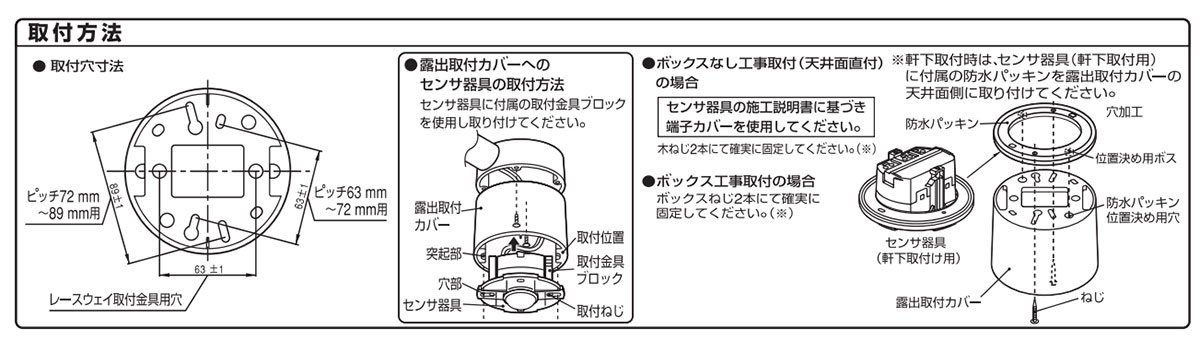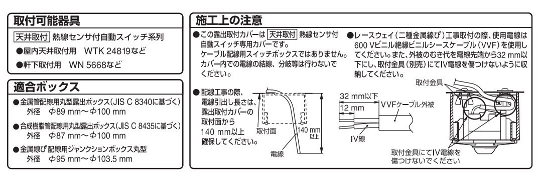 ※屋内専用の天井取付熱線センサ付自動スイッチ専用カバーです。ケーブル配線用スイッチボックスではありません。カバー内での電線の結線、分岐などは行わないでください。