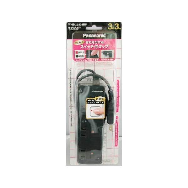 - ■ランプを無くして省エネ追求。新開発、ランプレススイッチ。 押すたびに「切」「入」が変わり、白と赤で色表示します。 ■インテリアに調和するフラットボディ。 デザイン性を追求したプッシュスイッチ採用で、スイッチまわりのフラット化を実現。フラットボディだからリビングなどのインテリアにも調和します。 ■用途に応じて選べる2タイプ。 横差しコンセント/ACアダプタ対応斜め差しコンセント パナソニック ザ・タップZ(ACアダプター対応)(3コ口)(スナップキャップ・3mコード付) (WHS25339BP)